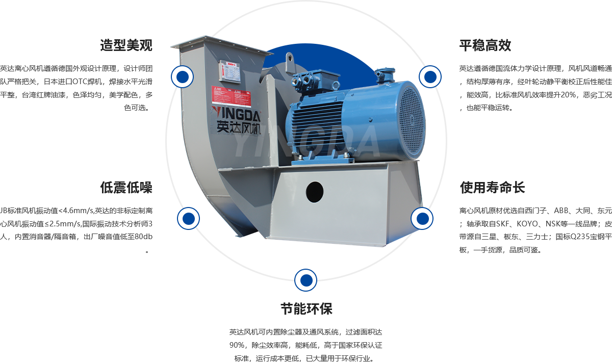 風(fēng)機葉輪、機殼可選用優(yōu)質(zhì)Q235碳鋼,304不銹鋼,玻璃鋼纖維,全部模具化生產(chǎn),采用電焊、手段,表面清潔平整、不存在焊接變形現(xiàn)象,葉輪經(jīng)動、靜平衡校正,其平衡精度不大于4.0級。