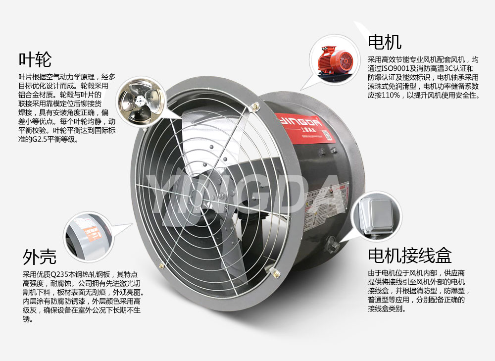 英達風機采用生產電機生產設備和檢查手續齊全的風機專用配套電機,均通過ISO9001及消防高溫3C認證和防爆認證及能效標識。電機應與風機負載緊密配合,采用B3安裝結構。電機防護等級為IP54,絕緣等級F級,溫升等級B級。電機軸承應為滾珠式免潤滑型。電機功率儲備系數應按110%取,以提升風機使用的安全性。