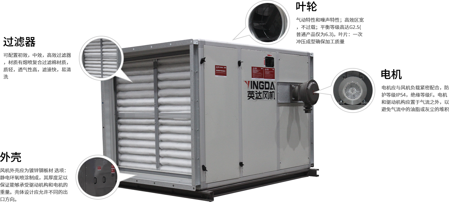 電機應與風機負載緊密配合,防護等級IP54,絕緣等級F。電機和驅動機構應置于氣流之外,以避免氣流中的油脂或灰塵的堆積。