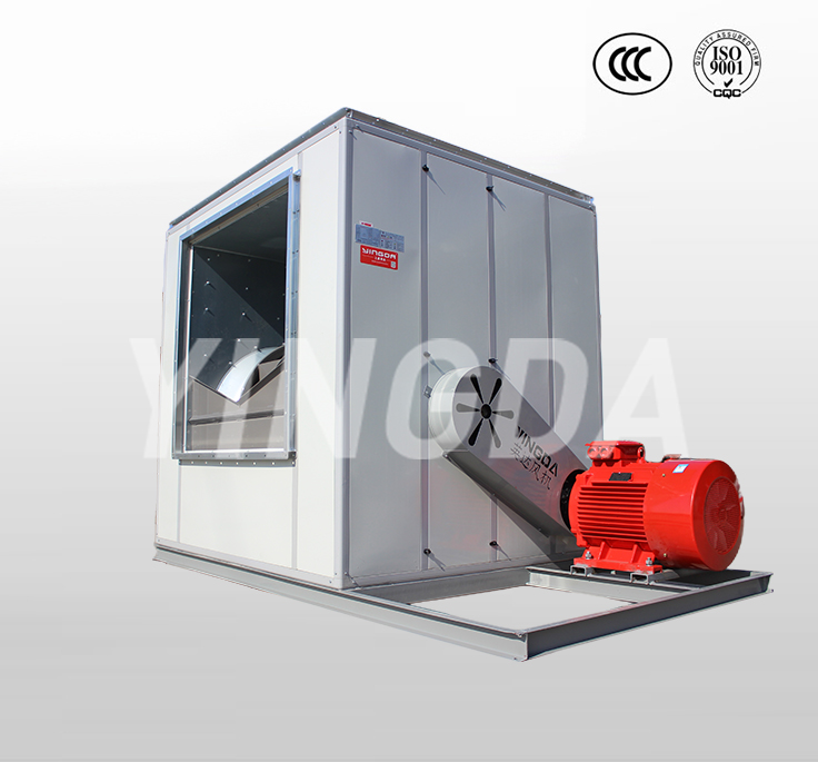 1.1.HTFC-V型柜式離心風機是一種葉片為后傾式箱形離心風機,產品由低噪聲后傾葉片式離心風機、電機、軸承、傳動件、消聲型箱體等組成。根據安裝位置的不同,提供12種不同的角度的進出風口位置,以滿足用戶不同的安裝需要。根據消防與通風的不同要求分A式和B式兩種類型,A式電機裝在箱體外,用于消防排煙,并經國家消防裝備監督質量檢驗中心按GA211-2009《消防排煙風機耐高溫試驗方法》進行耐高溫試驗,能在280℃高溫條件下連續運行60分鐘以上;B式電機裝在箱體內,用于通風換氣。