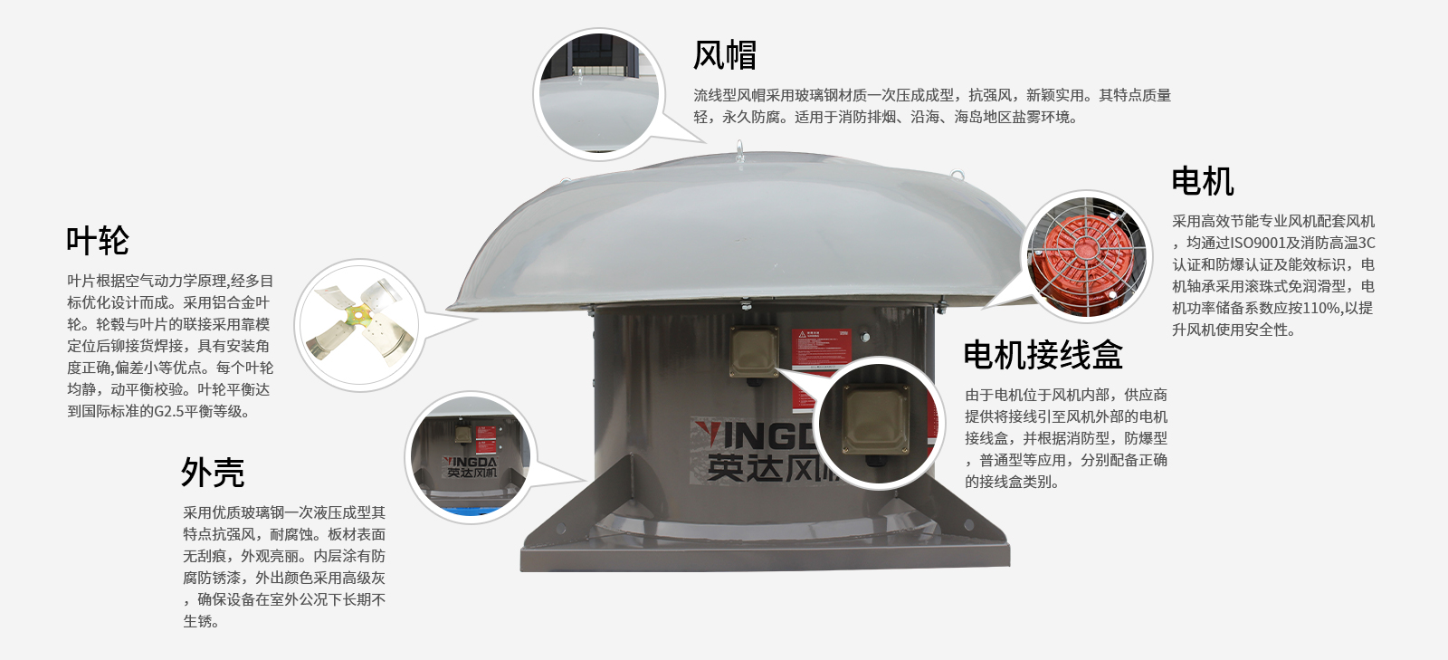 鋼制屋頂風(fēng)機(jī)機(jī)殼采用整體旋壓翻邊而成,玻璃鋼屋頂風(fēng)機(jī)機(jī)殼為玻璃鋼一次成形,風(fēng)機(jī)風(fēng)帽為玻璃鋼一次成形。