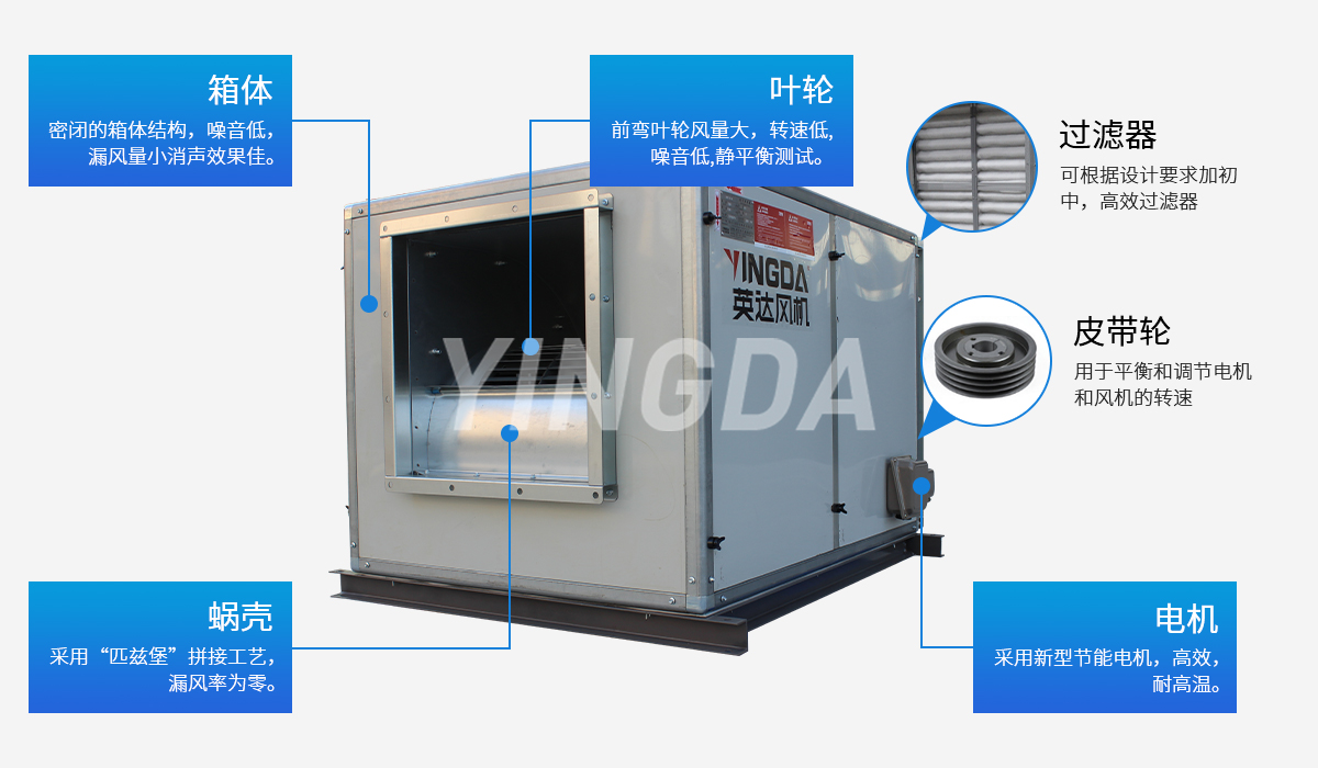 英達風(fēng)機蝸殼采用流線型雙進風(fēng)結(jié)構(gòu),“匹茲堡”拼接工藝,漏風(fēng)率為零;雙側(cè)板一次成型,精度高,減小裝配后尺寸誤差;葉片一次沖壓 成型,專門夾具確保葉片安裝精確定位。