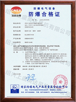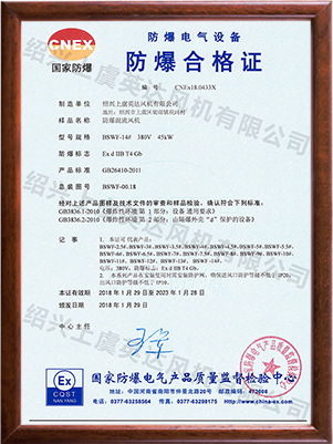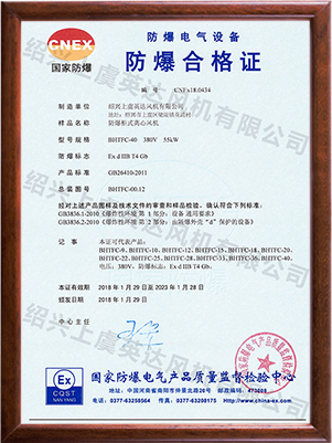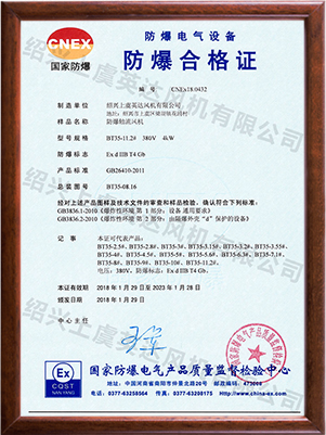 為適應防爆環境需要,風機可做成防爆風機,防爆等級為EXdⅡBT4,適用于易燃、易爆氣體的場所。整機通過國家防爆認證。